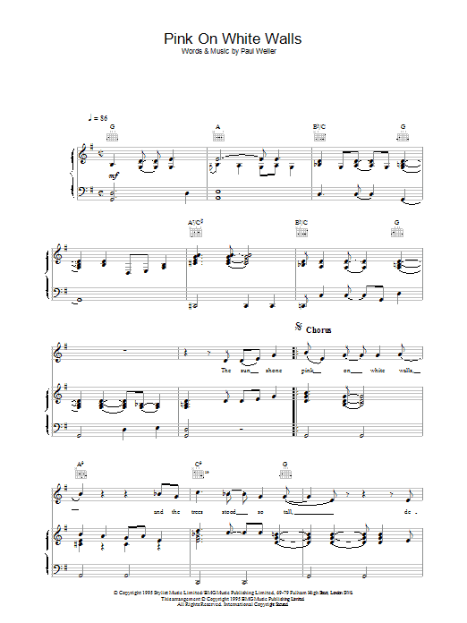 Download or print Paul Weller Pink On White Walls sheet music, chords and digital score arranged for Piano, Vocal & Guitar Chords. This Pop score includes 5 page(s).