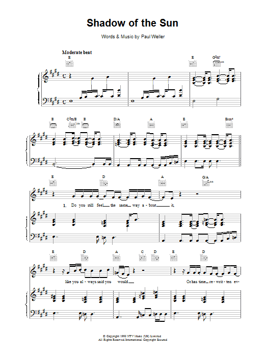 Download or print Paul Weller Shadow Of The Sun sheet music, chords and digital score arranged for Guitar Chords/Lyrics. This Rock score includes 3 page(s).