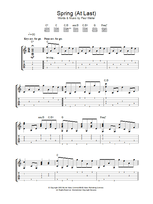 Download or print Paul Weller Spring (At Last) sheet music, chords and digital score arranged for Guitar Tab. This Pop score includes 3 page(s).