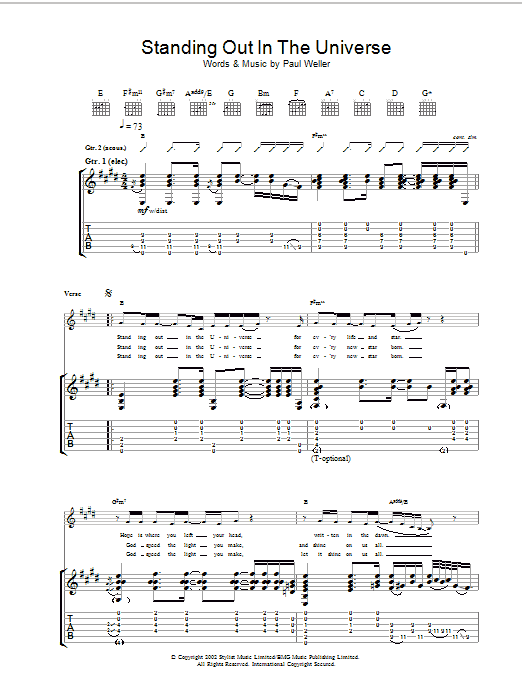 Download or print Paul Weller Standing Out In The Universe sheet music, chords and digital score arranged for Guitar Tab. This Pop score includes 5 page(s).