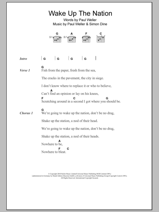 Download or print Paul Weller Wake Up The Nation sheet music, chords and digital score arranged for Guitar Chords/Lyrics. This Rock score includes 2 page(s).