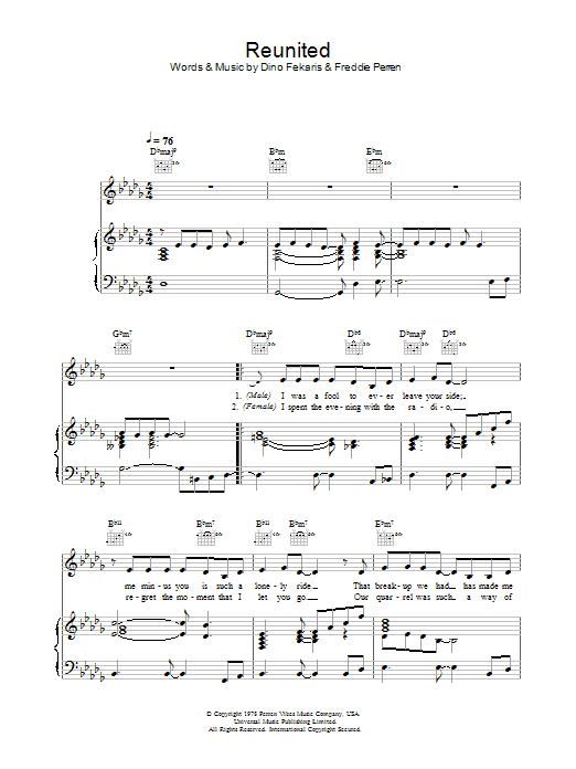 Download or print Peaches & Herb Reunited sheet music, chords and digital score arranged for Easy Piano. This Pop score includes 3 page(s).