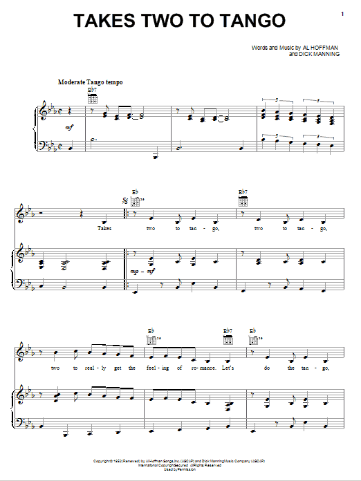 Download or print Pearl Bailey Takes Two To Tango sheet music, chords and digital score arranged for Piano, Vocal & Guitar Chords (Right-Hand Melody). This Pop score includes 3 page(s).