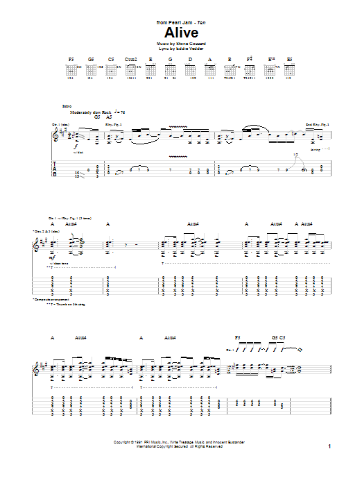 Download or print Pearl Jam Alive sheet music, chords and digital score arranged for Easy Guitar Tab. This Alternative score includes 5 page(s).