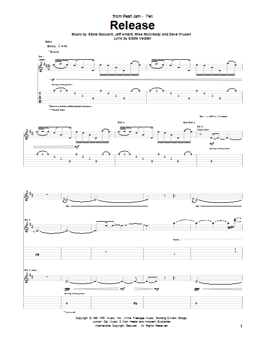 Download or print Pearl Jam Release sheet music, chords and digital score arranged for Guitar Tab. This Alternative score includes 13 page(s).
