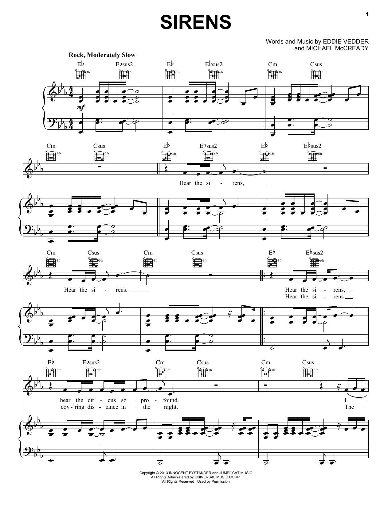 Download or print Pearl Jam Sirens sheet music, chords and digital score arranged for Piano, Vocal & Guitar Chords (Right-Hand Melody). This Pop score includes 6 page(s).