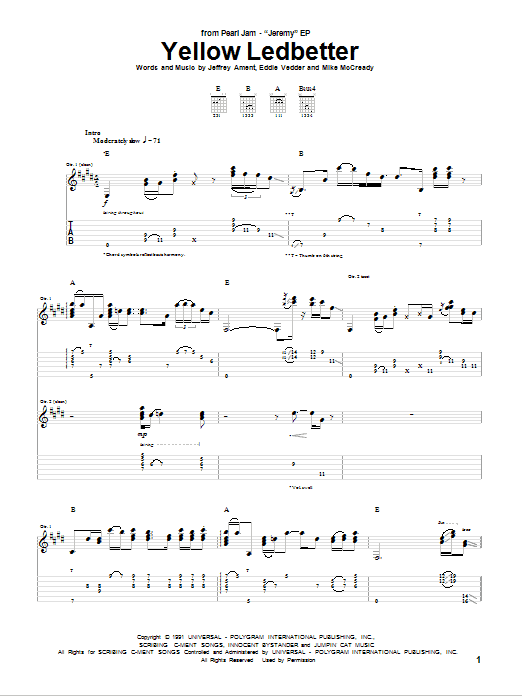 Download or print Pearl Jam Yellow Ledbetter sheet music, chords and digital score arranged for Guitar Tab. This Pop score includes 12 page(s).