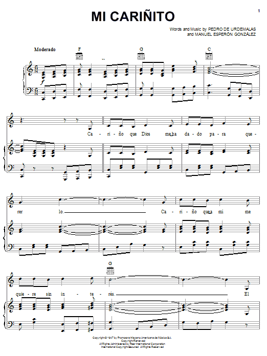 Download or print Pedro Fernandez Mi Carinito sheet music, chords and digital score arranged for Piano, Vocal & Guitar Chords (Right-Hand Melody). This Latin score includes 4 page(s).