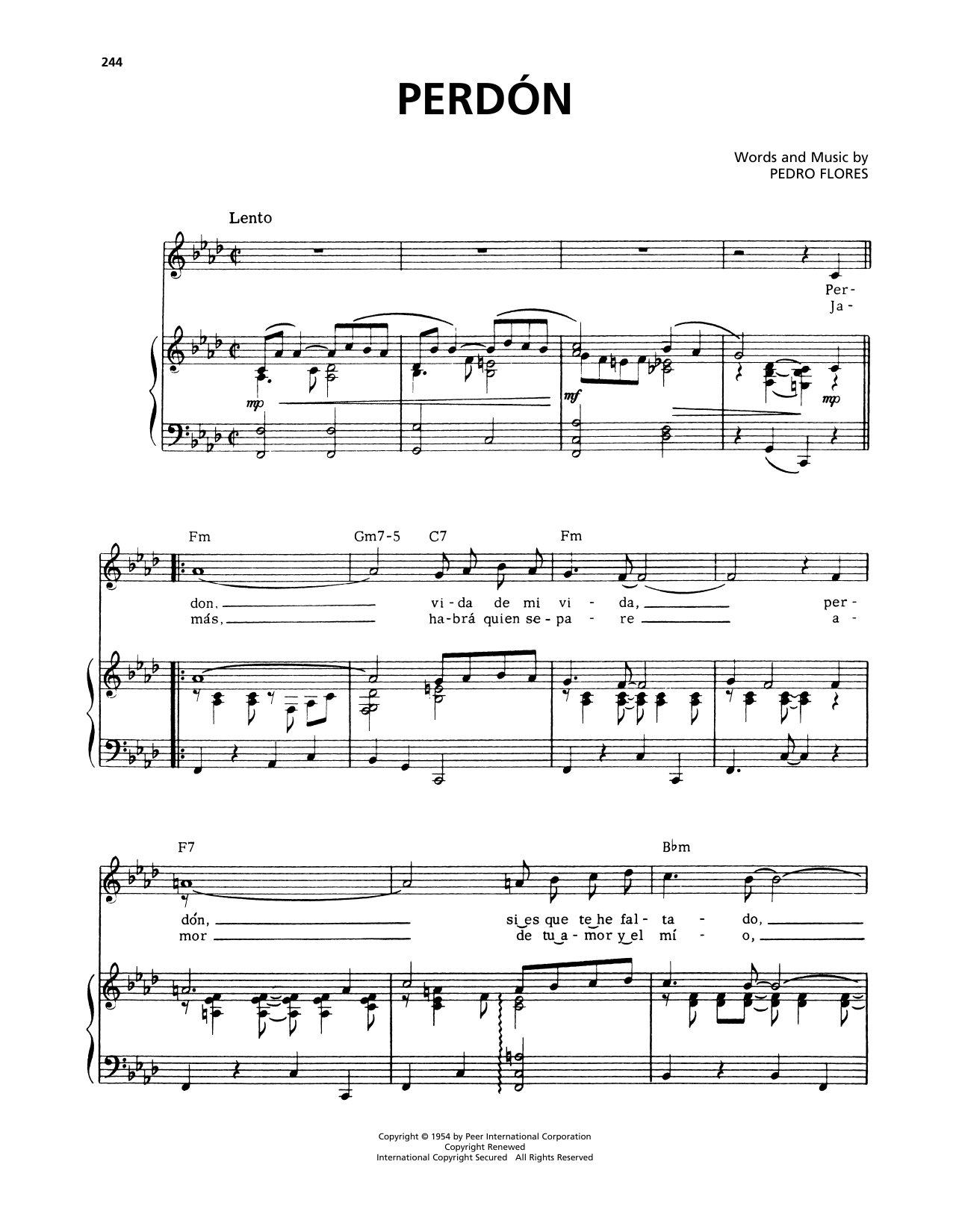 Download or print Pedro Flores Perdon sheet music, chords and digital score arranged for Piano, Vocal & Guitar Chords (Right-Hand Melody). This Spanish score includes 4 page(s).