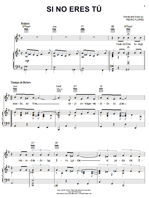 Download or print Pedro Flores Si No Eres Tu sheet music, chords and digital score arranged for Piano, Vocal & Guitar Chords (Right-Hand Melody). This Latin score includes 5 page(s).