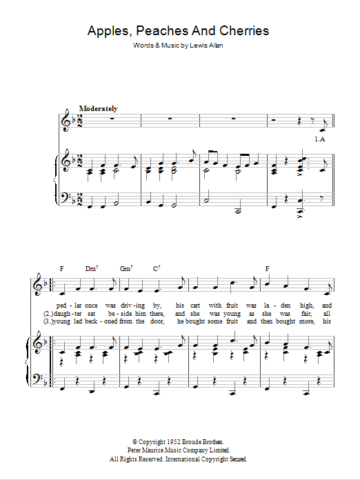 Download or print Peggy Lee Apples, Peaches And Cherries sheet music, chords and digital score arranged for Piano, Vocal & Guitar Chords. This Pop score includes 3 page(s).
