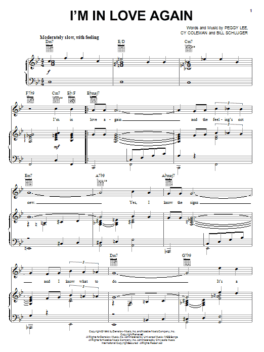 Download or print Peggy Lee I'm In Love Again sheet music, chords and digital score arranged for Piano, Vocal & Guitar Chords (Right-Hand Melody). This Standards score includes 3 page(s).