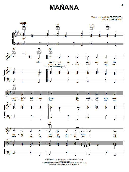 Download or print Peggy Lee Mañana sheet music, chords and digital score arranged for Real Book – Melody & Chords. This Jazz score includes 1 page(s).