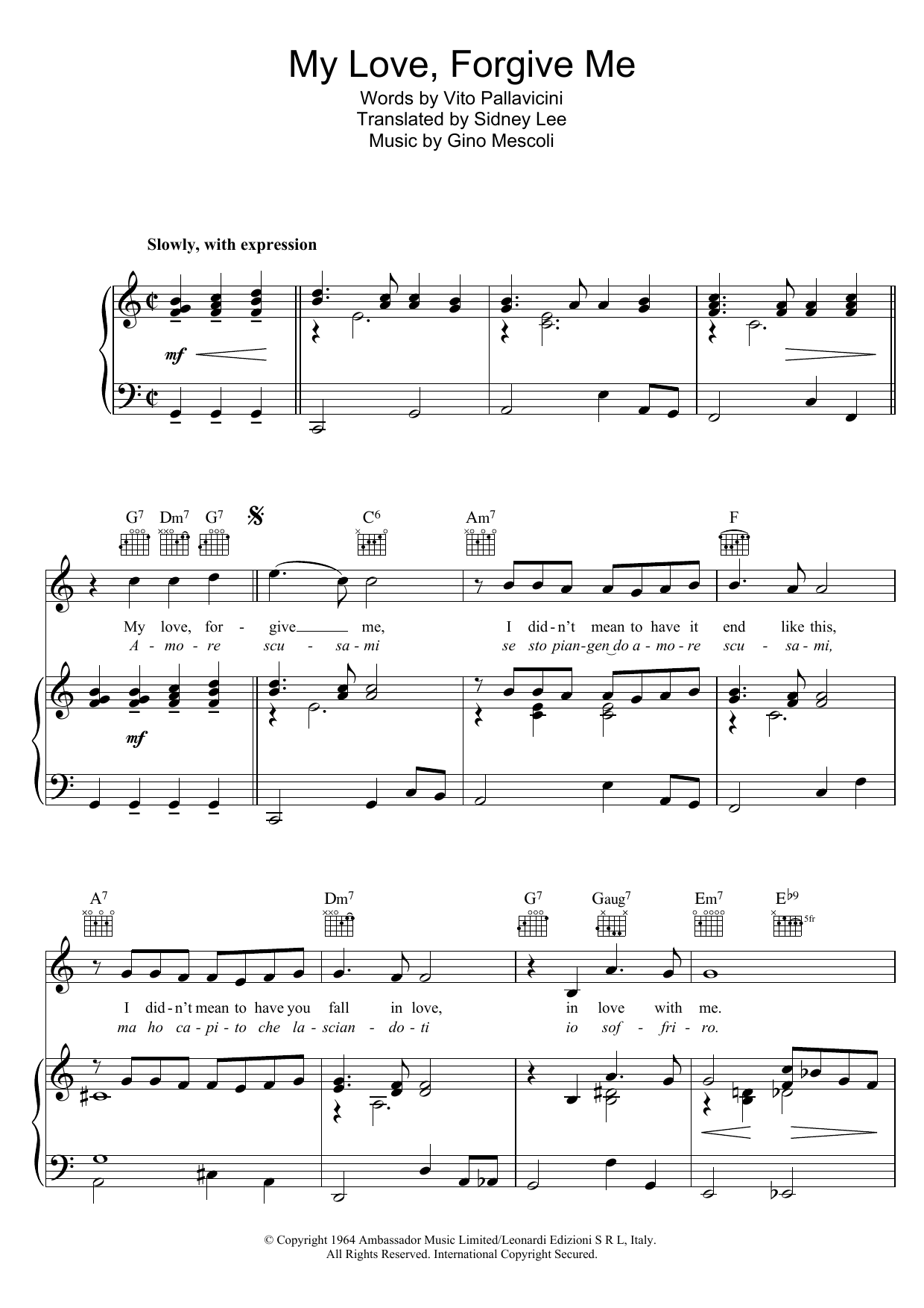 Download or print Peggy Lee My Love Forgive Me (Amore Scusami) sheet music, chords and digital score arranged for Piano, Vocal & Guitar Chords. This Standards score includes 4 page(s).