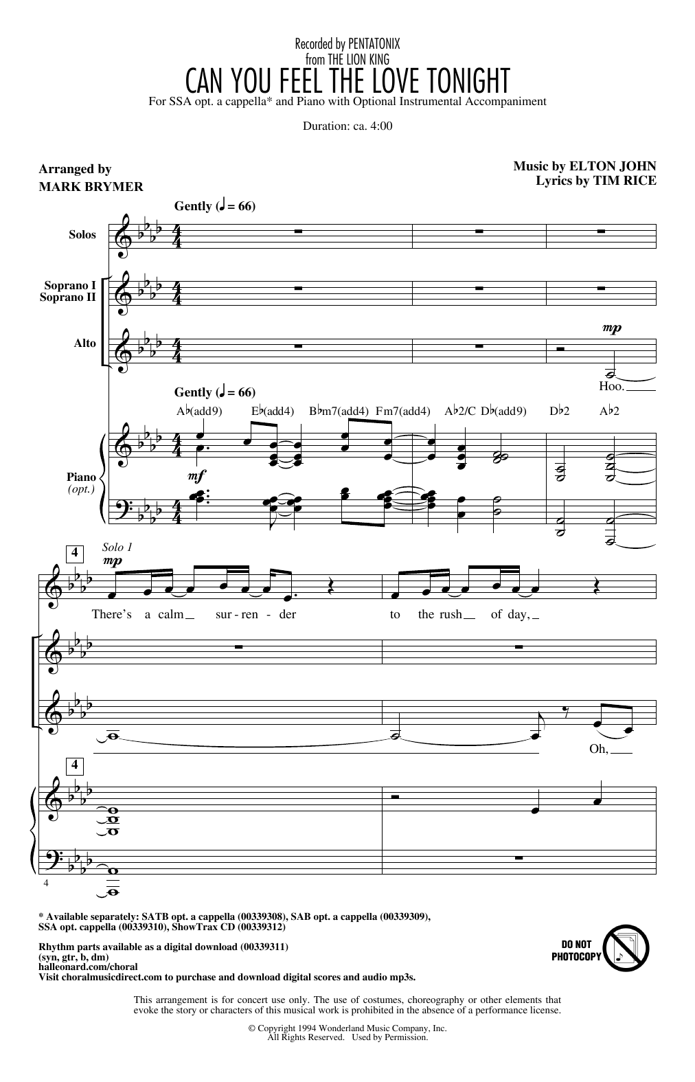 Quick facts Can You Feel The Love Tonight (from The Lion King) (arr. Mark Brymer) about digital sheet music