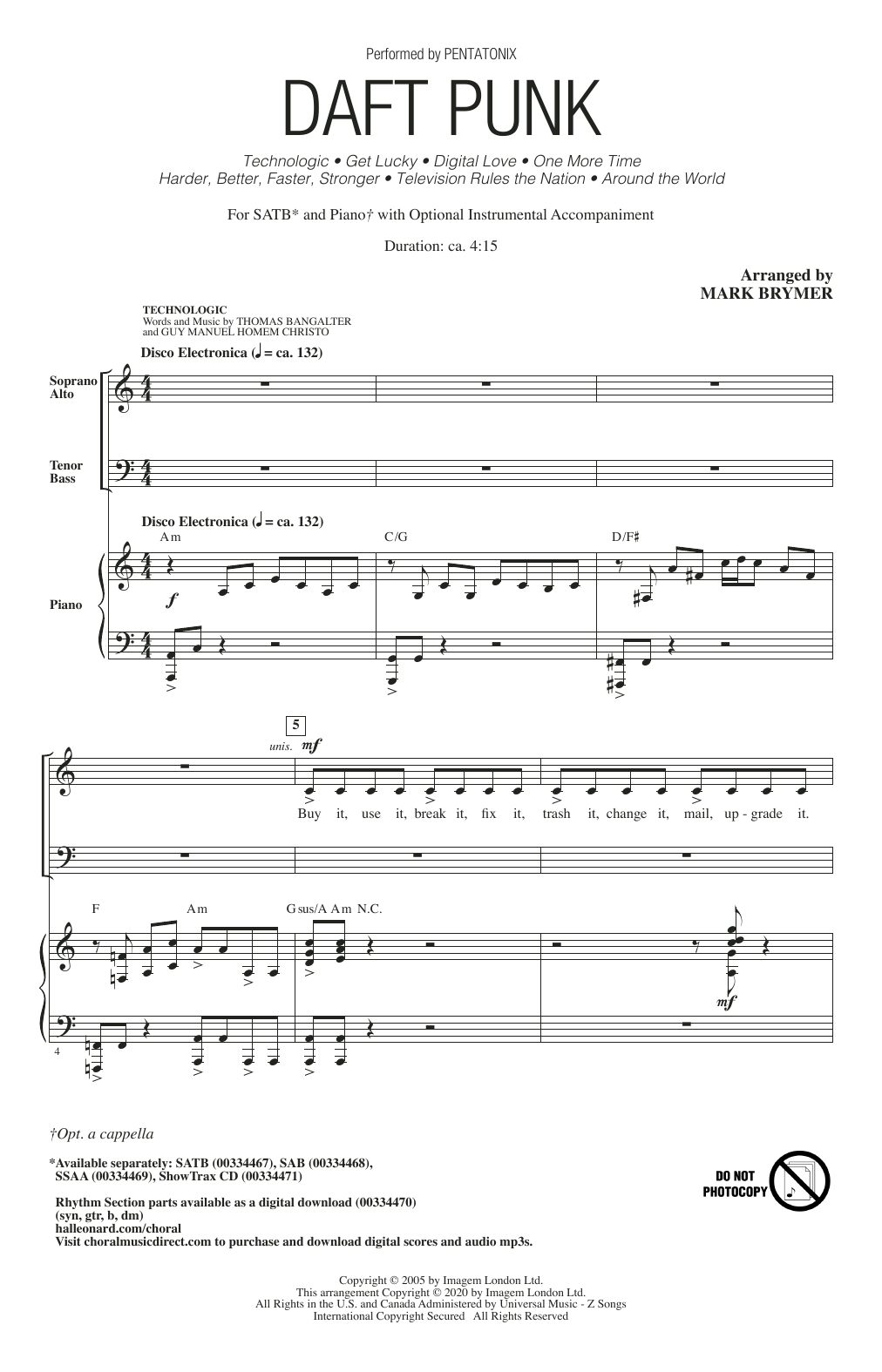 Download or print Pentatonix Daft Punk (Choral Medley) (arr. Mark Brymer) sheet music, chords and digital score arranged for SSAA Choir. This Pop score includes 23 page(s).