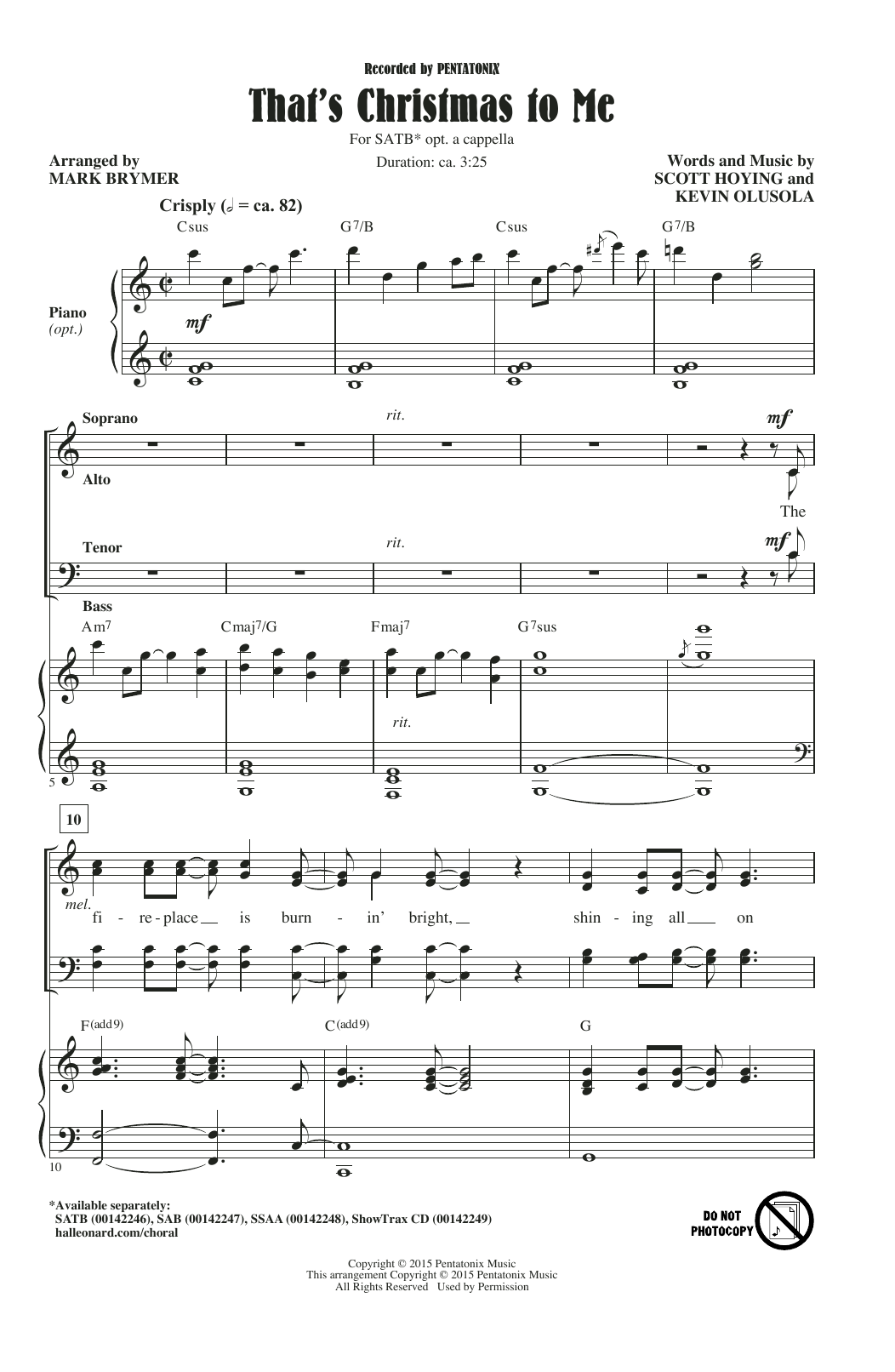 Download or print Pentatonix That's Christmas To Me (arr. Mark Brymer) sheet music, chords and digital score arranged for SAB Choir. This Christmas score includes 15 page(s).
