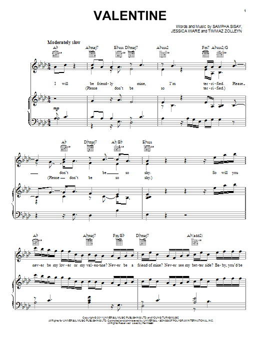 Download or print Pentatonix Valentine sheet music, chords and digital score arranged for Piano, Vocal & Guitar Chords (Right-Hand Melody). This Pop score includes 6 page(s).