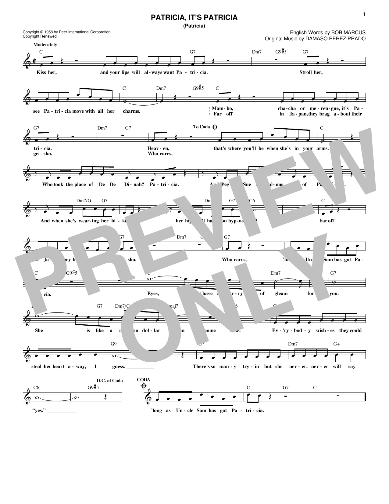 Download or print Perez Prado & His Orchestra Patricia, It's Patricia (Patricia) sheet music, chords and digital score arranged for Lead Sheet / Fake Book. This Jazz score includes 1 page(s).