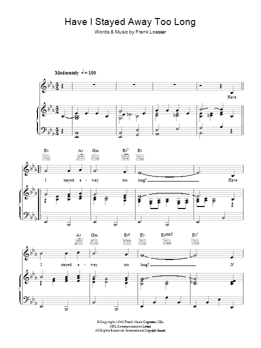 Download or print Perry Como Have I Stayed Away Too Long sheet music, chords and digital score arranged for Piano, Vocal & Guitar Chords. This Standards score includes 5 page(s).