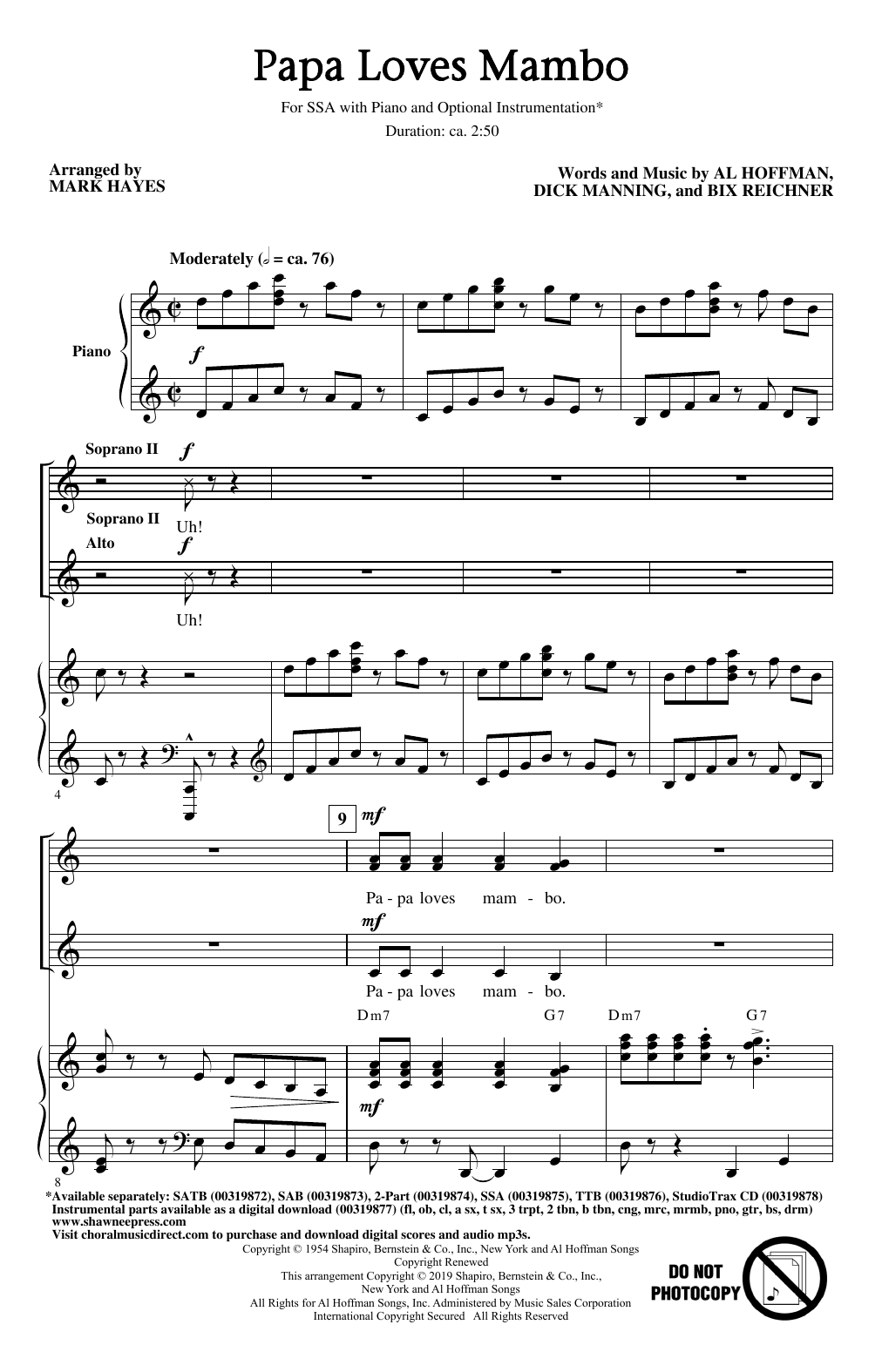 Download or print Perry Como Papa Loves Mambo (arr. Mark Hayes) sheet music, chords and digital score arranged for SAB Choir. This Jazz score includes 11 page(s).