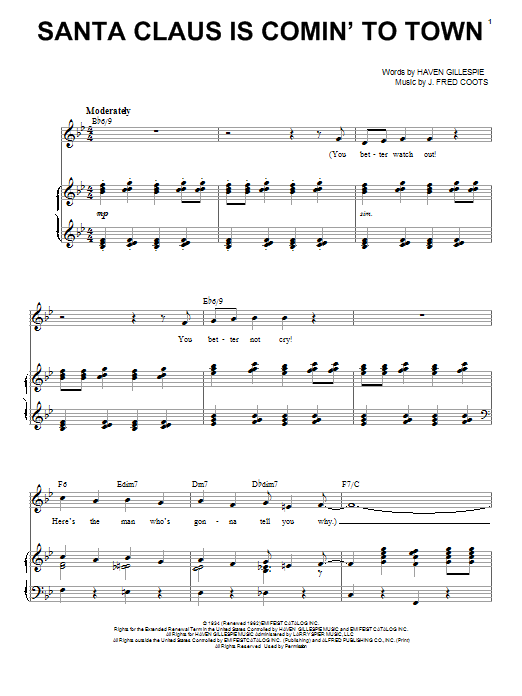 Download or print Perry Como Santa Claus Is Comin' To Town sheet music, chords and digital score arranged for Piano & Vocal. This Pop score includes 8 page(s).
