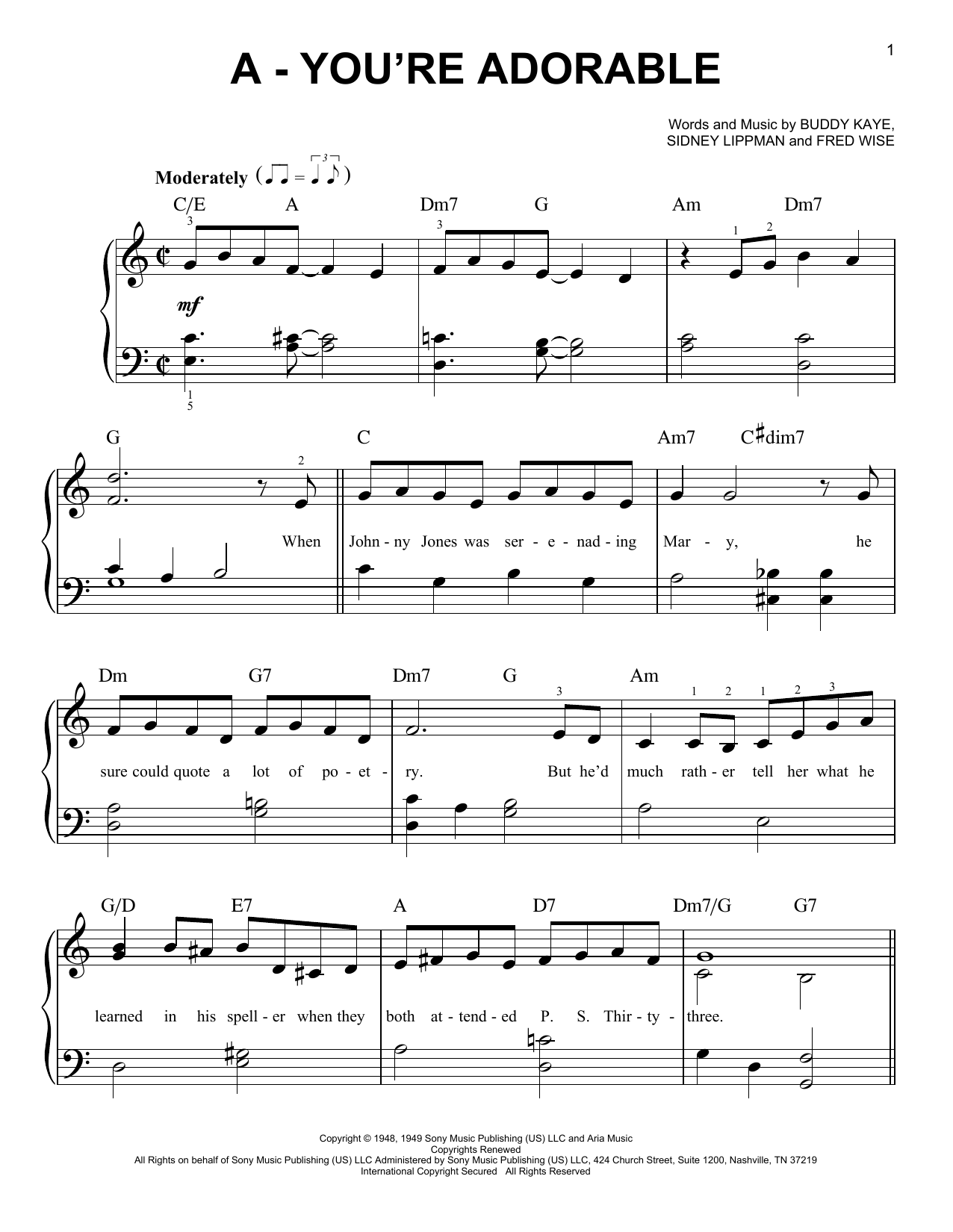 Download or print Perry Como & The Fontane Sisters A - You're Adorable sheet music, chords and digital score arranged for Easy Piano. This Children score includes 3 page(s).