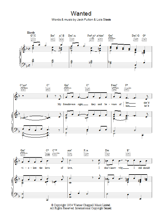Download or print Perry Como Wanted sheet music, chords and digital score arranged for Piano, Vocal & Guitar Chords. This Standards score includes 4 page(s).