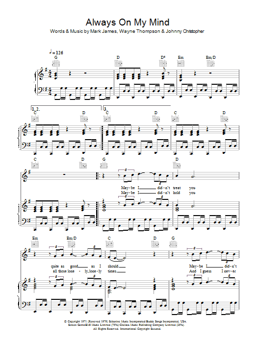 Download or print The Pet Shop Boys Always On My Mind sheet music, chords and digital score arranged for Piano, Vocal & Guitar Chords. This Pop score includes 5 page(s).