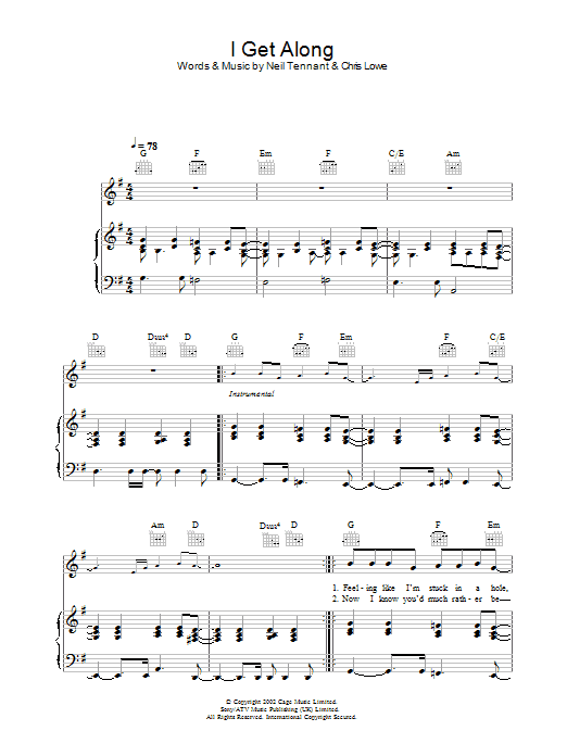 Download or print The Pet Shop Boys I Get Along sheet music, chords and digital score arranged for Piano, Vocal & Guitar Chords. This Pop score includes 6 page(s).