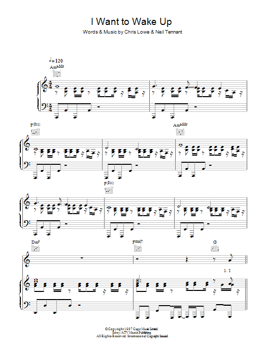 Download or print Pet Shop Boys I Want To Wake Up sheet music, chords and digital score arranged for Piano, Vocal & Guitar Chords. This Pop score includes 8 page(s).