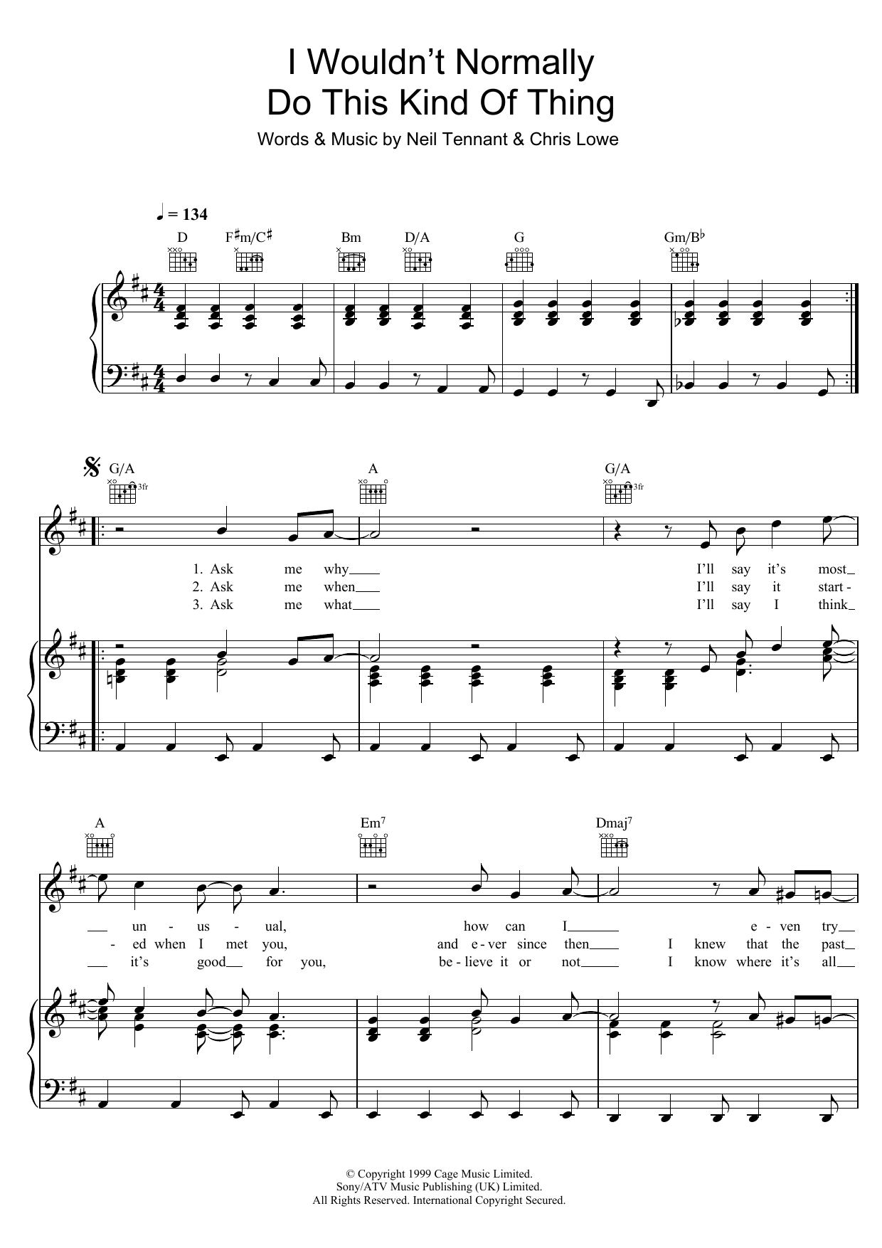 Download or print Pet Shop Boys I Wouldn't Normally Do This Kind Of Thing sheet music, chords and digital score arranged for Piano, Vocal & Guitar Chords. This Pop score includes 4 page(s).