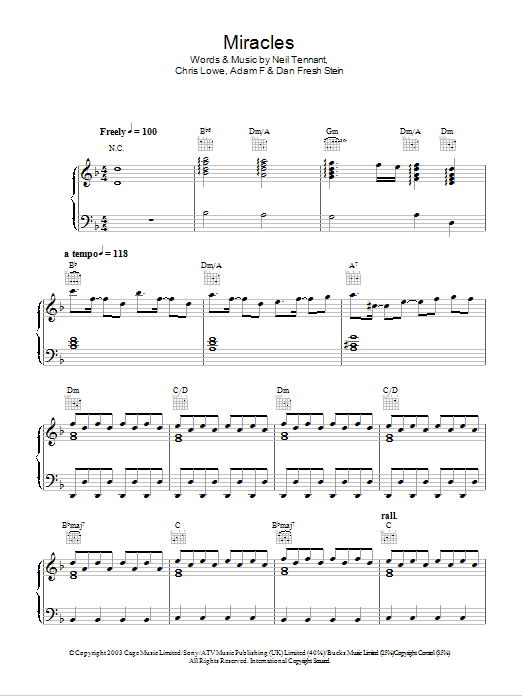 Download or print The Pet Shop Boys Miracles sheet music, chords and digital score arranged for Piano, Vocal & Guitar Chords. This Pop score includes 7 page(s).