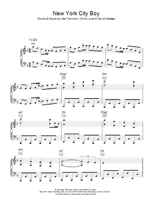 Download or print The Pet Shop Boys New York City Boy sheet music, chords and digital score arranged for Piano, Vocal & Guitar Chords. This Pop score includes 7 page(s).