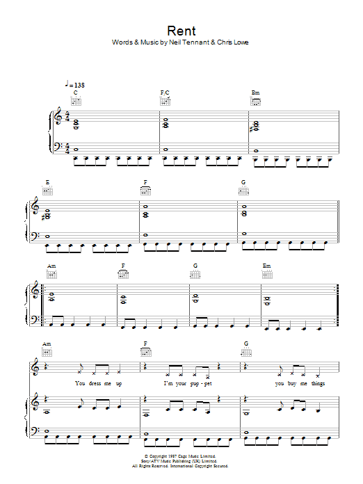 Download or print Pet Shop Boys Rent sheet music, chords and digital score arranged for Guitar Chords/Lyrics. This Pop score includes 3 page(s).