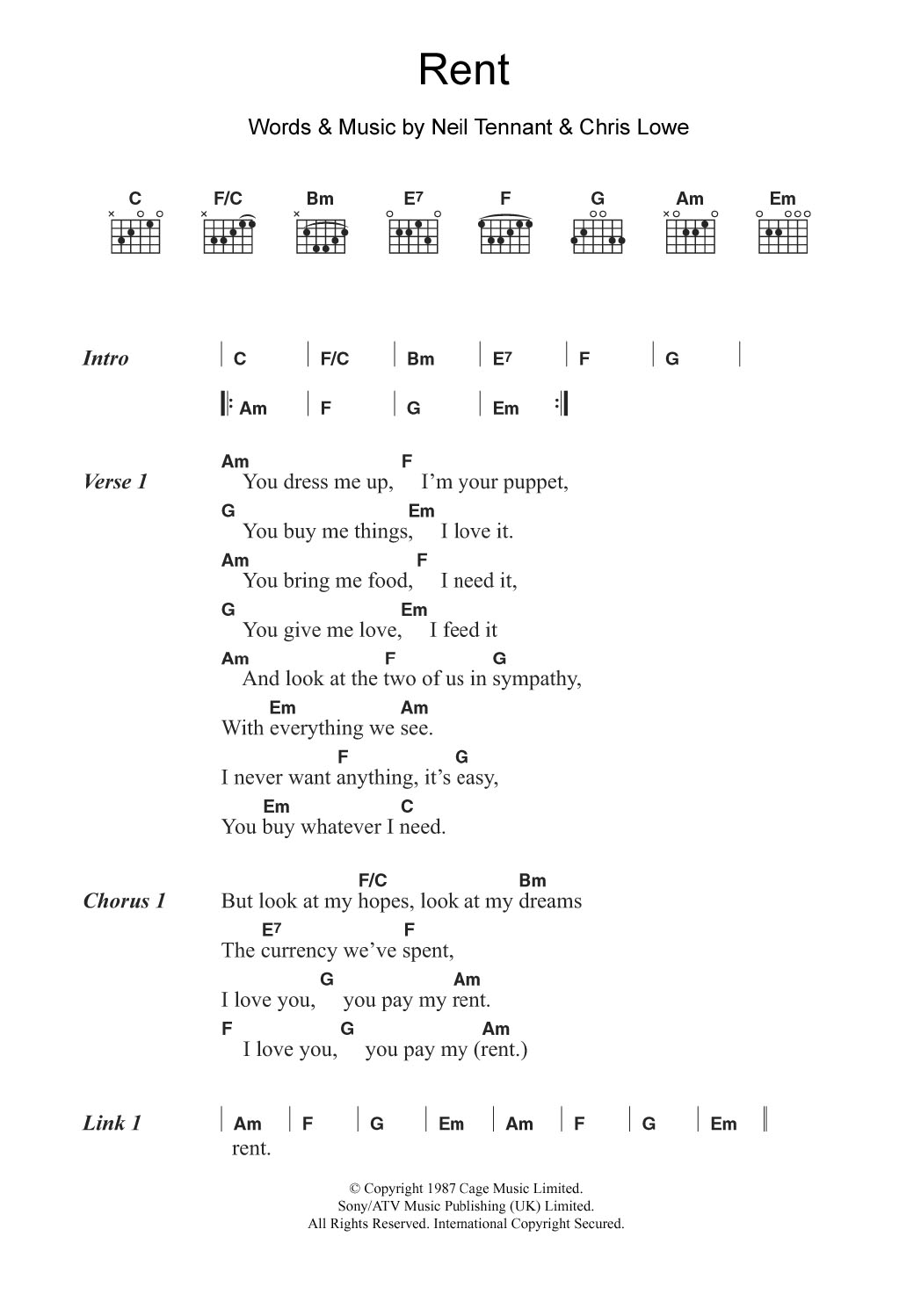 Download or print Pet Shop Boys Rent sheet music, chords and digital score arranged for Guitar Chords/Lyrics. This Pop score includes 3 page(s).
