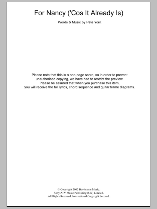 Download or print Pete Yorn For Nancy (‘Cos It Already Is) sheet music, chords and digital score arranged for Guitar Chords/Lyrics. This Rock score includes 2 page(s).