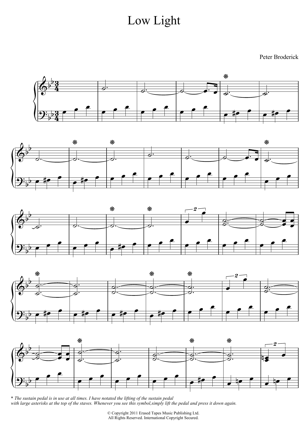 Download or print Peter Broderick Low Light sheet music, chords and digital score arranged for Piano Solo. This Classical score includes 3 page(s).