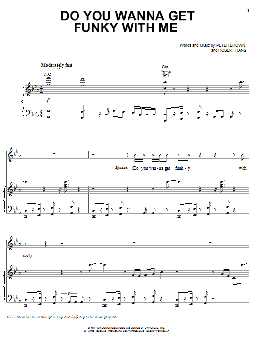 Download or print Peter Brown Do You Wanna Get Funky With Me sheet music, chords and digital score arranged for Piano, Vocal & Guitar Chords (Right-Hand Melody). This Disco score includes 9 page(s).