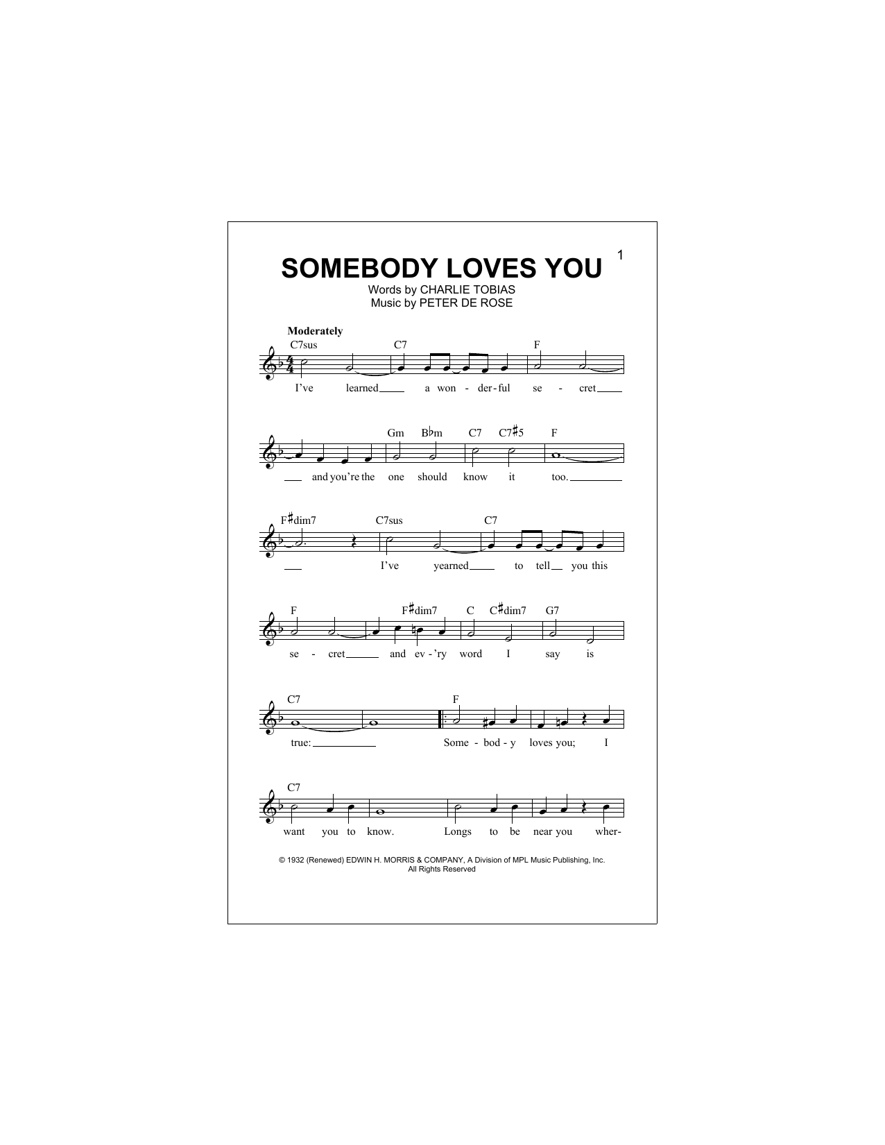 Download or print Peter De Rose Somebody Loves You sheet music, chords and digital score arranged for Lead Sheet / Fake Book. This Jazz score includes 2 page(s).