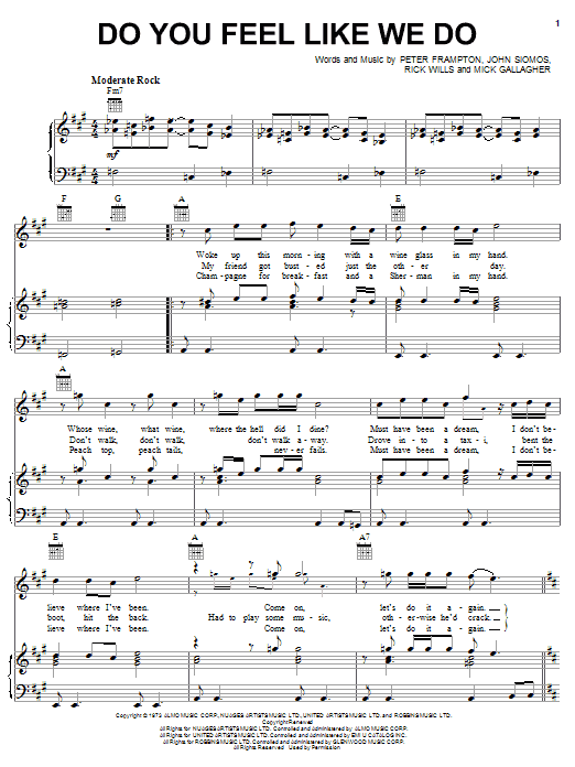 Download or print Peter Frampton Do You Feel Like We Do sheet music, chords and digital score arranged for Guitar Lead Sheet. This Rock score includes 2 page(s).