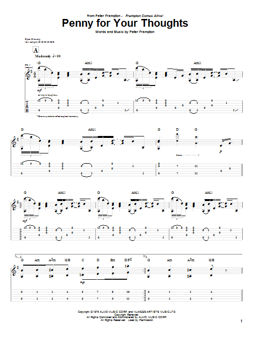 Download or print Peter Frampton Penny For Your Thoughts sheet music, chords and digital score arranged for Guitar Tab. This Pop score includes 2 page(s).