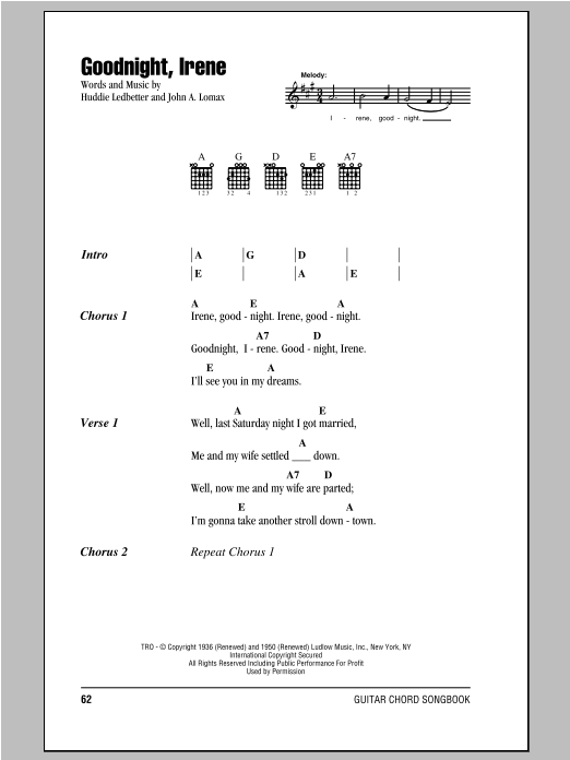 Download or print Peter, Paul & Mary Goodnight, Irene sheet music, chords and digital score arranged for Easy Ukulele Tab. This Country score includes 2 page(s).