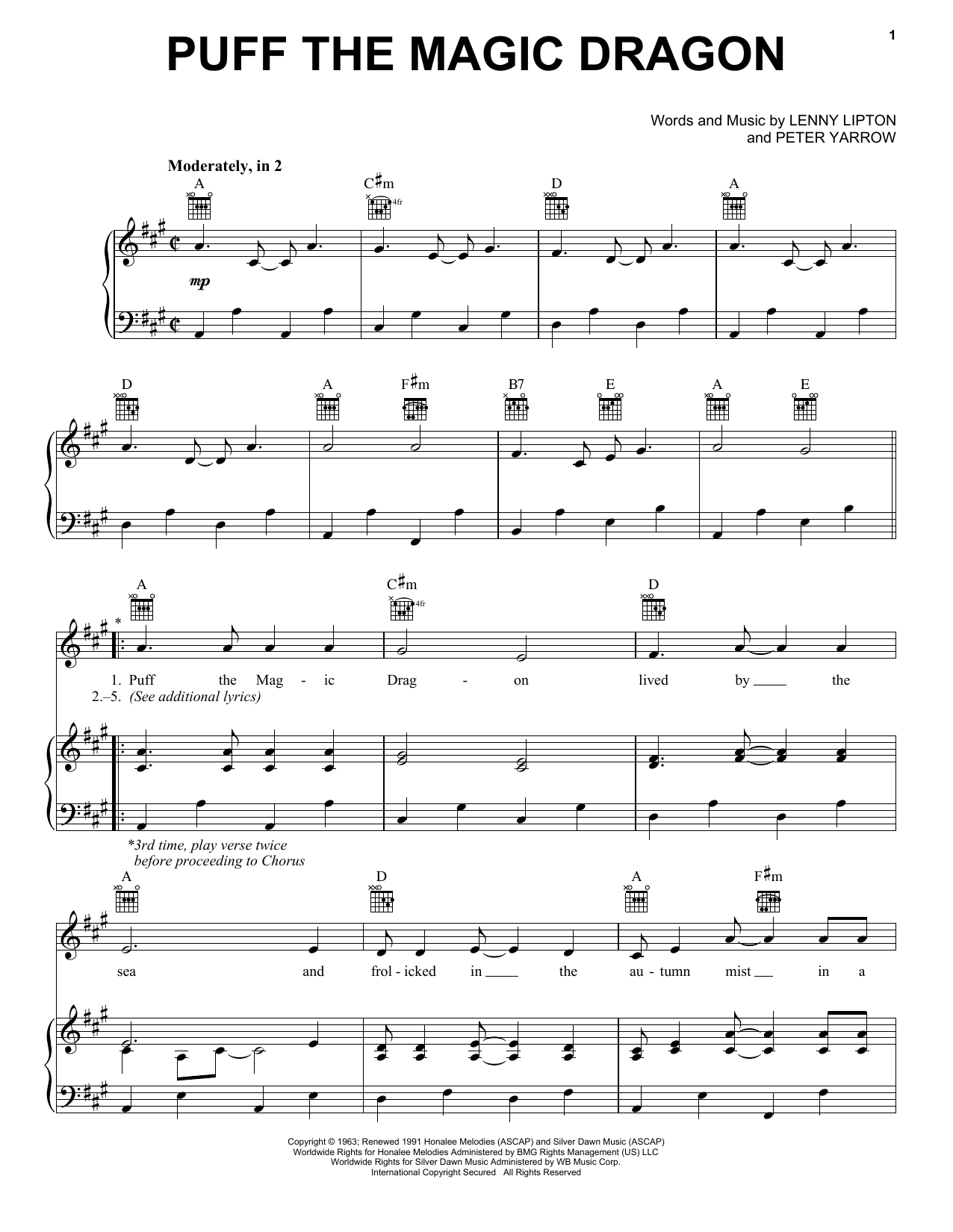 Download or print Peter, Paul & Mary Puff The Magic Dragon sheet music, chords and digital score arranged for Super Easy Piano. This Children score includes 2 page(s).