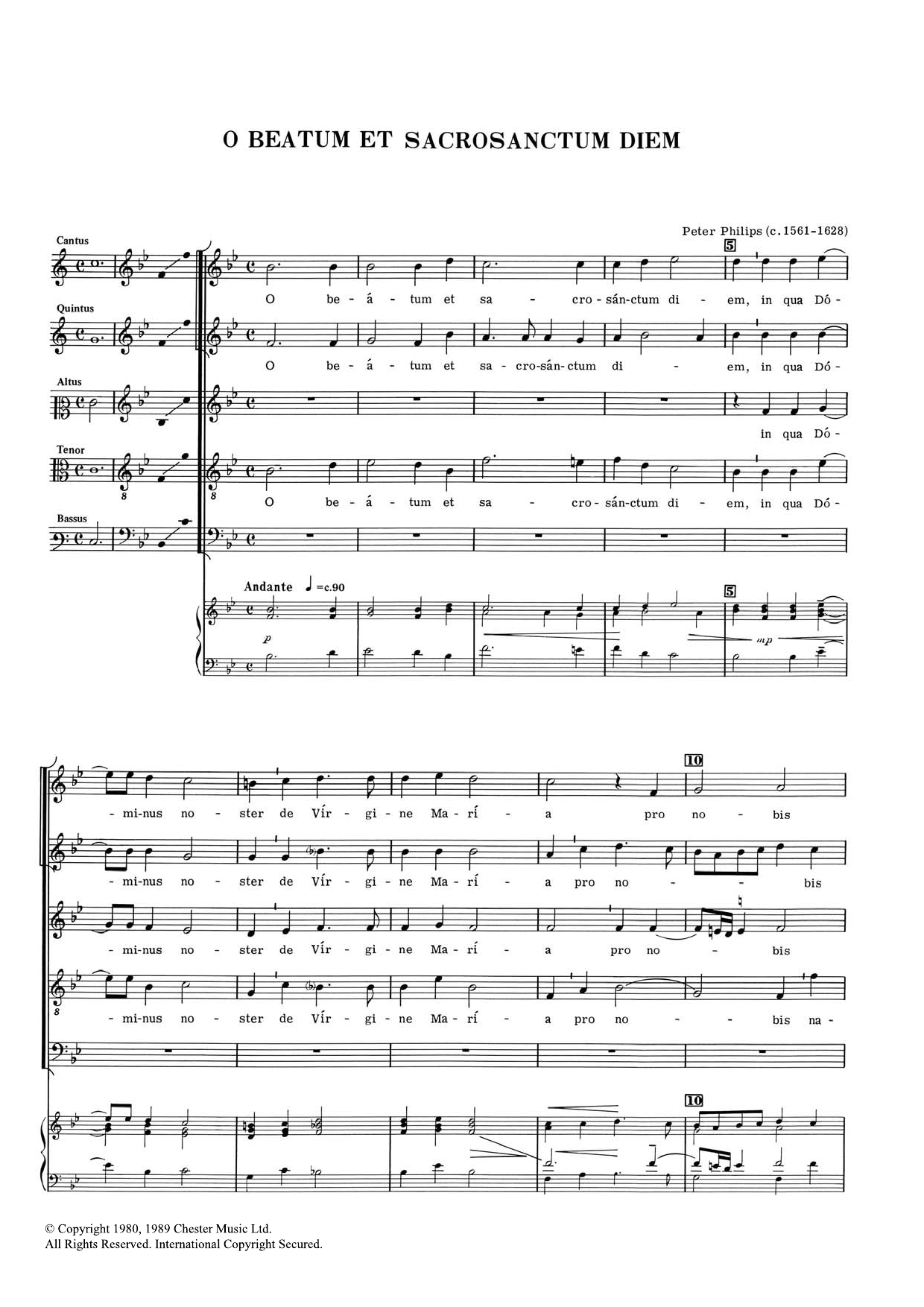 Download or print Peter Philips O Beatum Et Sacrosanctum Diem sheet music, chords and digital score arranged for SATB Choir. This Classical score includes 6 page(s).