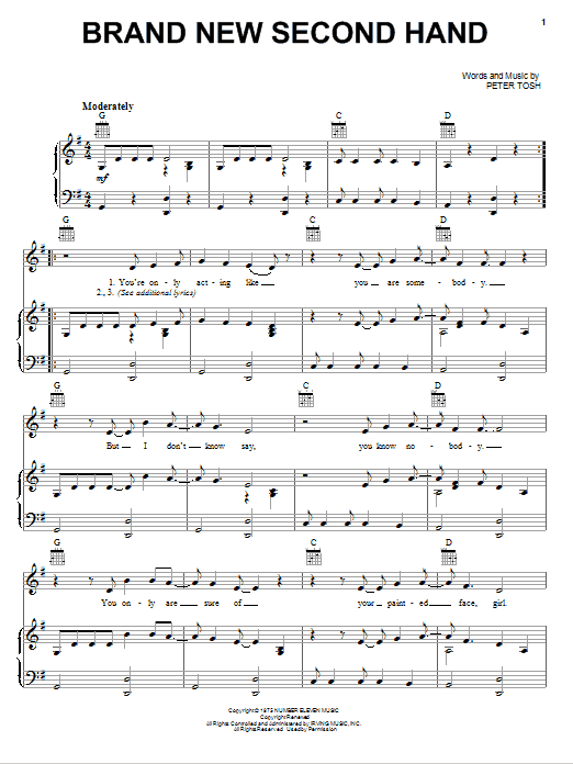 Download or print Peter Tosh Brand New Second Hand sheet music, chords and digital score arranged for Piano, Vocal & Guitar Chords (Right-Hand Melody). This Pop score includes 3 page(s).