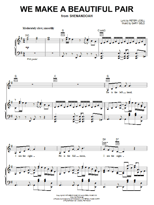 Download or print Peter Udell We Make A Beautiful Pair sheet music, chords and digital score arranged for Piano, Vocal & Guitar Chords (Right-Hand Melody). This Love score includes 7 page(s).