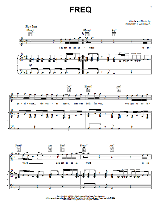 Download or print Pharrell Williams Freq sheet music, chords and digital score arranged for Piano, Vocal & Guitar Chords (Right-Hand Melody). This Pop score includes 4 page(s).