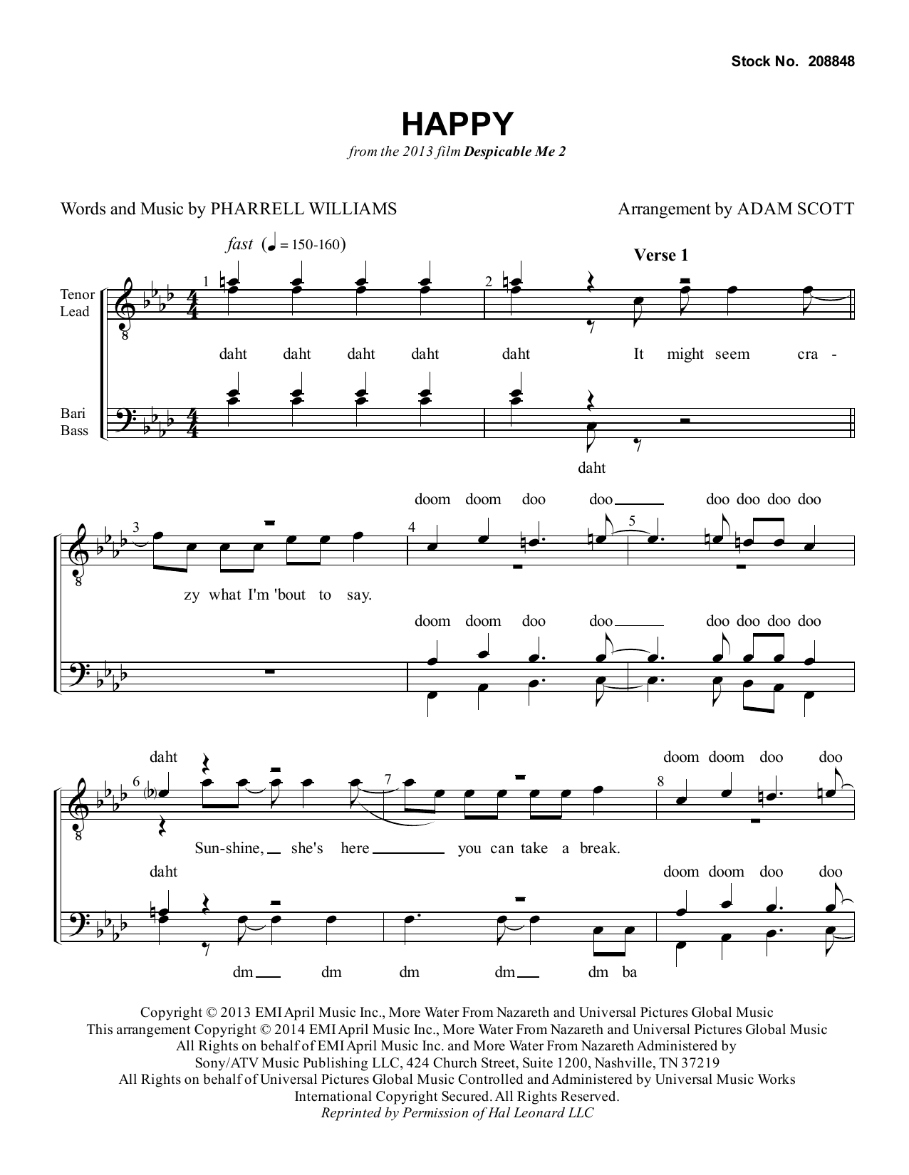 Download or print Pharrell Williams Happy (from Despicable Me 2) (arr. Adam Scott) sheet music, chords and digital score arranged for TTBB Choir. This Barbershop score includes 13 page(s).