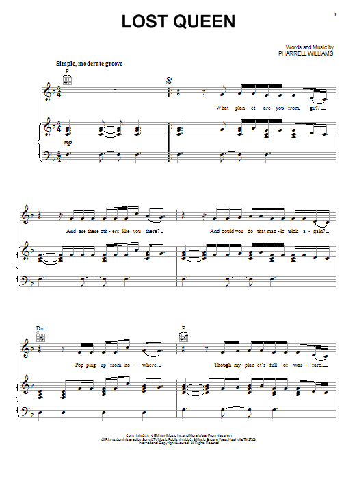 Download or print Pharrell Williams Lost Queen sheet music, chords and digital score arranged for Piano, Vocal & Guitar Chords (Right-Hand Melody). This Pop score includes 4 page(s).